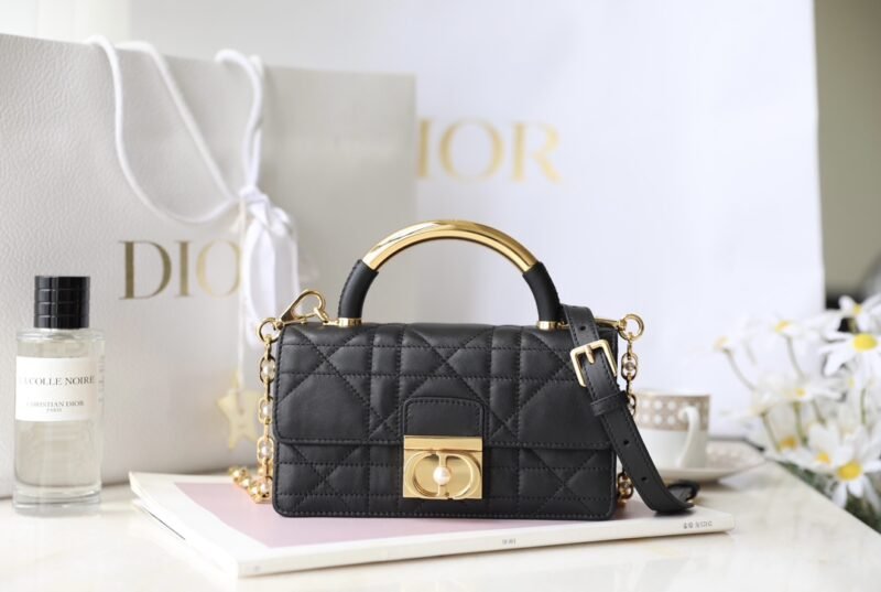 - Gold-finish metal top handle engraved with Christian Dior Paris
